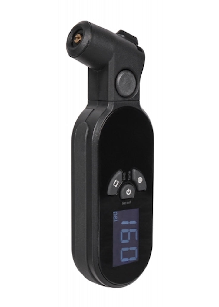 A sleek, lightweight and compact digital tyre pressure gauge. Works seamlessly with Presta and Schrader valves without changing internal head parts. The illuminated digital gauge is